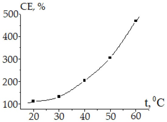 A regular increase in the current efficiency of selenium (VI) reduction with the production of selenium powders is observed with an increase in the initial concentration of selenate ions (Figure 5) and with an increase in the temperature of the solution (Figure 6).