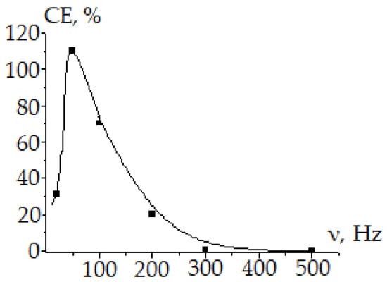 Influence of the alternating current frequency on the current efficiency of selenate ions recovery: H2SO4 = 100 g/L; i = 500 A/m2; = 15.0 g/L; t = 20 °C.