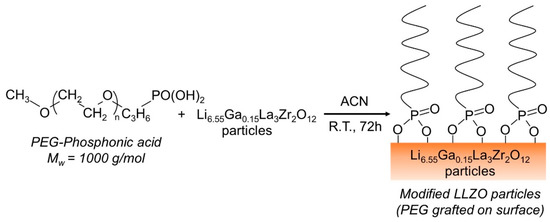 The exceptional binding properties of phosphonic acid onto oxide surfaces [40] was the prime motivation for using phosphonic acid terminated PEG. Phosphonic acid-based surface modification of LLZO particles was carried out as shown in Figure 1. The phosphonic acid terminated PEG is expected to bind on the surface of the LLZO particles either by mono-, bi-, or tridentate coordination. The most probable coordination mode (bidentate) has been depicted in Figure 1.