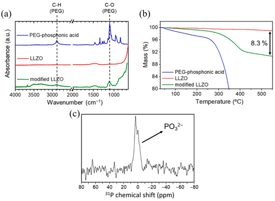 (a) FTIR characterization of PEG-phosphonic acid, pristine LLZO, and modified LLZO. (b) TGA of PEG-phosphonic acid, pristine LLZO, and modified LLZO. (c) Solid-state NMR 31P 1D spectrum of the modified LLZO.