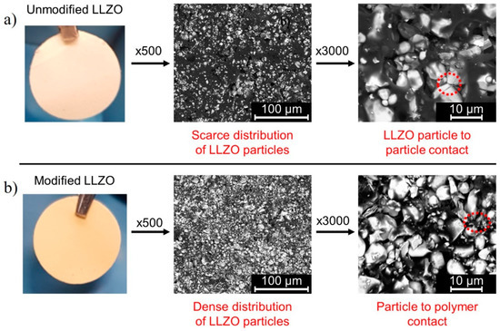 Surface morphology characterizations of the composite membranes: (a) PEO:LiTFSI + 30 vol% LLZO (from left to right: photography, SEM at a magnitude of 500× and 3000×), and (b) PEO:LiTFSI + 30 vol% modified LLZO (from left to right: photography, SEM at a magnitude of 500× and 3000×).