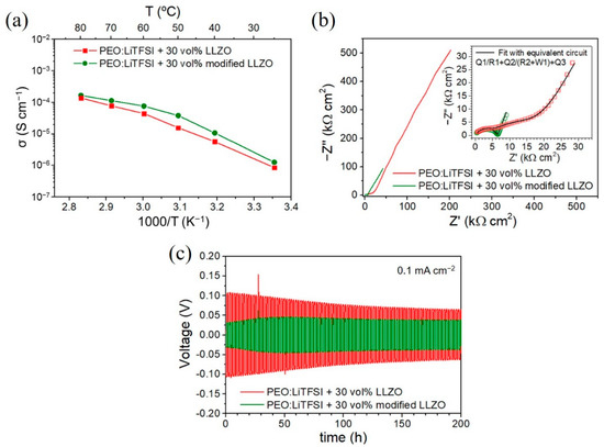 Electrochemical characterizations of the composite membranes PEO:LiTFSI + 30 vol% LLZO with (a) Arrhenius plots, (b) Nyquist plots at 25 °C, and (c) plating/striping measurements at 70 °C.