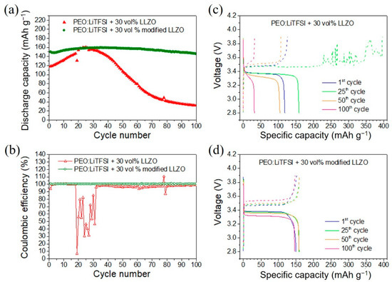 Galvanostatic cycling at 0.1C of LiFePO4/Carbon Black/PEO:LiTFSI cathodes vs. Li metal anode, using PEO:LiTFSI + 30 vol% LLZO membranes. (a) Specific discharge capacity upon cycling, (b) coulombic efficiency upon cycling, (c) charge/discharge curves of the 1st, 25th, 50th, and 100th cycles of unmodified-LLZO electrolyte, and (d) charge/discharge curves of the 1st, 25th, 50th, and 100th cycles of modified-LLZO electrolyte.