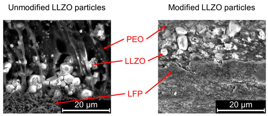 The SEM images show that in unmodified-LLZO electrolytes, the LLZO particles tend to agglomerate and segregate unevenly throughout the thickness of the cells. On the other hand, the modified-LLZO particles tend to uniformly distribute throughout the thickness of the electrolyte. This is due to the uniform polymer layer that was grafted on to the surface of the LLZO particles preventing particle agglomeration and allowing better particle distribution. This in turn leads to a better interfacial contact between the Li metal electrodes for the cells containing modified-LLZO particle loaded electrolyte membranes.
