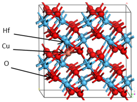 Supercell crystal structure of HfO2 (red, blue, and brown spheres represent O ions, Hf ions, and Cu ion, respectively).