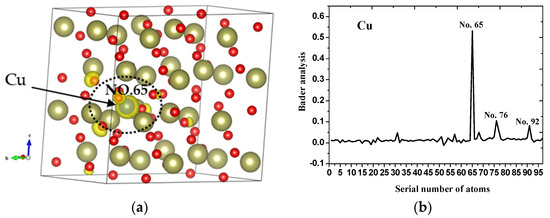 The case in which two electrons are lost from Cu is considered. To determine the location at which the specific charges of the two lost electrons are distributed, the modified Bader analysis was performed (Figure 2b). The x-axis represents the atomic numbers in the system, which can be correlated to the atoms shown in Figure 2a. The y axis represents the specific charge distribution. Most of the two electrons lost by Cu are distributed on atom number 65. The CHGCAR file indicates that No. 65 is a Cu atom. The second highest distribution of electrons can be found in atom numbers 76 and 92, which are located near the doped Cu ions. The distribution of the remaining atoms can be ignored. This shows that the three atoms (especially atom number 65) have the greatest ability to capture the carrier charge, and the lost charges are concentrated at these positions.