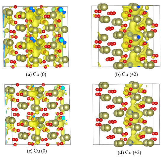 The formation of conductive Cu channels was investigated using the method described by Kresse et al. [17]. For the Cu (0) and Cu (+2) systems, the isosurface plots of the partial charge density of the impurity energy were calculated, as shown in Figure 3.