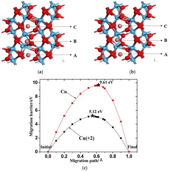 RS occurs mainly due to the formation and fracture of conductive channels, owing to the migration of metal atoms in resistive materials [10]. The migration barriers of Cu and Cu (+2) in HfO2 were calculated using the nudged elastic band (NEB) method. The migration paths are shown in Figure 4a,b. The calculated migration barriers are shown in Figure 4c. The calculated result shows that the migration barrier of Cu (+2) is 5.12 eV at the same initial and terminal positions, which is much smaller than that of the directly doped Cu atom (9.61 eV). The migration barrier is closely related to the operating voltage of a device. This also shows that, under voltage driving, the migration barrier of the Cu (+2) ion is much smaller than that of the directly doped Cu atom (9.61 eV). Oxidized or doped Cu at the pole can migrate more easily in the form of Cu ions in the resistive material, and this will have a great influence on the formation of conductive metal channels.