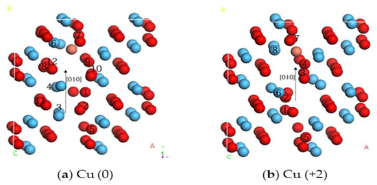 It is evident from Table 4 that, due to the migration of the Cu (0) and Cu (+2) ions, the surrounding elements experience varying degrees of vibrational displacement. In the Cu (0) system, the number of atoms whose atomic structure is displaced by more than 0.1 Å is higher than that in the Cu (+2) system, with a smaller displacement deviation. Although there is no specific relationship between atomic vibration and the stability of the entire system, a large deviation in the atomic displacement reflects that the system needs a large strain energy. This is also consistent with the calculated migration barriers.