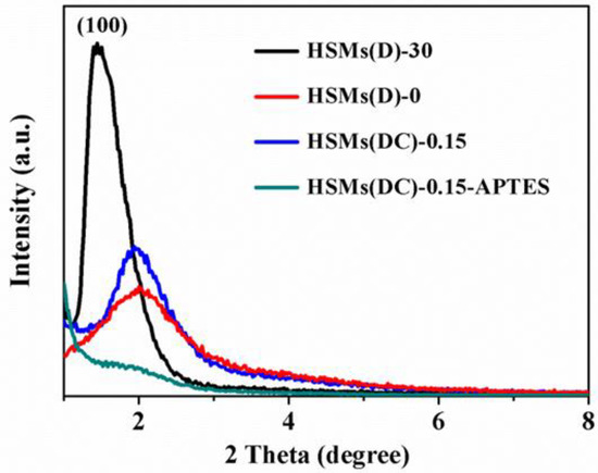 Figure 1 shows the XRD patterns of HSMs(D)-30, HSMs(DC)-0, HSMs(DC)-0.15, and HSMs(DC)-0.15-NH2. As can be seen, Figure 1 presents a sharp diffraction peak, indicating the existence of an ordered mesoporous structure for the HSMs(D)-30 sample synthesized with dextran as a template. Figure 1 also shows that the intensity of diffraction peaks for HSMs(DC)-0 with CTAB as a template and HSMs(DC)-0.15 with dextran and CTAB as templates were relatively reduced compared with that of HSMs(D)-30. In addition, the 2θ angle shifted from 1.46° to 2.0°, and the corresponding d(100) space value decreased from 6.16 to 4.42 nm, implying that the additive CTAB template affected the pore order degree. After modification with amine groups, as revealed in Figure 1, a notable reduction in peak d(100) intensity was observed for HSMs(DC)-0.15-APTES compared with that of HSMs(DC)-0.15, implying that the organic functional group modification of HSMs(DC)-0.15 affected the pore order structure. These observations illustrated that the ordered pore silica samples were successfully synthesized using the sol-gel method with dextran, dextran–CTAB, and CTAB as templates. The XRD patterns of the samples HSMs(D)-50 and HSMs(D)-80 also are shown in Figure S1 (Supporting Information). These results suggest that the ordered porous structure deteriorated with the increase in the reaction temperature during the synthesis process.