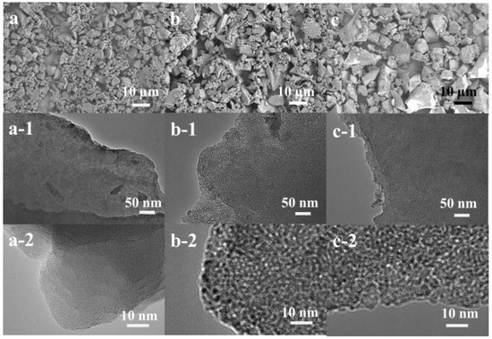 The morphologies and microstructures of the prepared samples were characterized by SEM and TEM, as shown in Figure 2. The SEM images for all samples show an irregular bulk construction. As the amount of CTAB increased, the larger porous silica began to be synthesized. The high-magnification SEM images of HSMs(DC)-0.15 are shown in Figure S2, the SEM images clearly display abundant mesopore and micropore structures with different pore sizes inside HSMs(DC)-0.15. Moreover, the rich hierarchical porous structure is directly observable in the TEM images shown in Figure 2(a1–c1). The high-magnification TEM images (Figure 2(a2–c2)) clearly demonstrate that HSMs(DC)-0.15 and HSMs(DC)-0 had a mesoporous structure and a micropore structure with irregular arrangement. The mesopores size was around 2.0–4.0 nm, and the size of the micropores was less than 2 nm, which was consistent with the following observation of the pore size distribution curves obtained from the N2 adsorption isotherm and CO2 adsorption isotherm (Figure 3b,d,e).