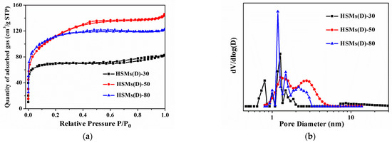 The isotherms of N2 adsorption–desorption and the distributions of pore size for the HSMs and amine-modified samples are shown in Figure 3. The pore size distributions for HSMs were analyzed using the DFT model, and those of amine-modified samples were evaluated using the BJH model. The main reason for this was that the DFT model could provide a reasonable and reliable approach for analyzing pore size distribution over the complete nanopore range [38]. Mesopore size is often assessed by the BJH method [39]. Their texture parameters are listed in Table 1. As shown in Figure 3a, the isotherms of N2 adsorption–desorption for the HSMs(D) samples with dextran as a template exhibited a transitional sorption behavior between standard type I and IV, indicating the micro/mesoporous nature of the material. Meanwhile, the hysteresis loop in the p/p0 range of 0.4–0.9 was assigned to the H4 type and further improved the existence of mesopores. The isotherms exhibited an increasing amount of adsorption at low relative pressure, suggesting the presence of micropores. In addition, the corresponding pore distributions for HSMs(D) samples are shown in Figure 3b; these samples exhibited several pore distribution peaks, mainly the presence of mesopores with a lightly broad distribution of pore diameters centered within the range of 2.0–4.0 nm, along with micropores less than 2.0 nm in size, which agreed well with the TEM-evaluated results. It is worthwhile to note that the HSMs(D)-30 sample possessed narrow micropores; the pore distribution was less than 1.0 nm as calculated by the DFT method. As shown in Table 1, the samples of HSMs(D) had middle BET surface areas in the range from 269 to 406 m2/g and pore volumes in the range of 0.13–0.23 cm3/g. When the reaction temperature increased to 50 and 80 °C, compared with HSMs(D)-30, the micropore surface area for HSMs(D)-50 and HSMs(D)-80 decreased, whereas the mesopore surface area increased, suggesting that the reaction temperature was a key factor that affected the micro/mesoporous structure of HSMs(D).