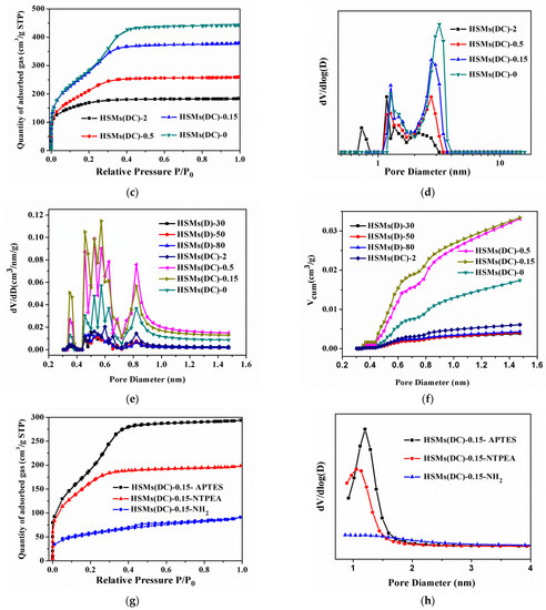 N2 adsorption-desorption isotherm (a) for HSMs(D)-30, HSMs(D)-50, HSMs(D)-80 and the corresponding pore size distributions (b) (using N2 adsorption isotherms with DFT model); N2 adsorption-desorption isotherm (c) for HSMs(DC)-2, HSMs(DC)-0.5, HSMs(DC)-0.15, HSMs(DC)-0 and the corresponding pore size distributions (d) (using N2 adsorption isotherms with DFT model); the narrow micropore of pore size distribution (e) and pore volume (f) for HSMs(D)-30, HSMs(D)-50, HSMs(D)-80, HSMs(DC)-2, HSMs(DC)-0.5, HSMs(DC)-0.15, HSMs(DC)-0 (using CO2 adsorption isotherms at 273 K with DFT model); N2 adsorption-desorption isotherm (g) for HSMs(DC)-0.15-APTES, HSMs(DC)-0.15-NTPEA, HSMs(DC)-0.15-NH2 and the corresponding pore size distributions (h) (using N2 adsorption isotherms with BJH model).
