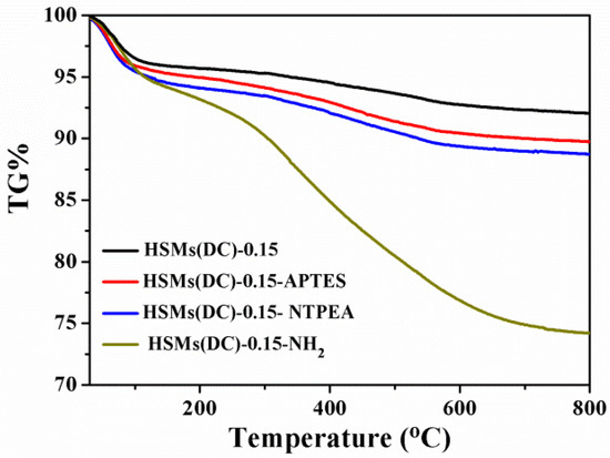 Figure 5 reveals the TGA profiles of HSMs(DC)-0.15, HSMs(DC)-0.15-APTES, HSMs(DC)-0.15-NTPEA, and HSMs(DC)-0.15-NH2. As can be seen, it was observed that the weight loss of all samples before reaching 200 °C was attributed to the adsorbed water molecules and the residual solvent [46]. Furthermore, Figure 5 shows that the weight loss of approximately 2.92 wt% for HSMs(DC)-0.15 was recorded within the range of 200–800 °C, which generally corresponded to the dehydration of the silanol groups in the pore channels and residue of organic components. After amine modification with APTES and NTPEA, the weight loss of HSMs(DC)-0.15-APTES and HSMs(DC)-0.15-NTPEA reached 5.38 and 5.45 wt%, respectively, in the range of 200–800 °C, because of the decomposition of the organic functional group. Therefore, the amine-modified amounts were calculated to be ca. 2.46 and 2.53 wt%, respectively, after subtracting the weight loss of approximately 2.92 wt% for HSMs(DC)-0.15. Comparably, for HSMs(DC)-0.15-NH2, as shown in Figure 5, the weight loss was enhanced, and a weight loss of approximately 19.23 wt% for HSMs(DC)-0.15-NH2 was recorded within the range of 200–800 °C. The amine-modified HSMs(DC)-0.15 samples were determined by the weight loss observed in the temperature range, and the -NHx contents for the HSMs(DC)-0.15-APTES, HSMs(DC)-0.15-NTPEA, and HSMs(DC)-0.15-NH2 were calculated to be 1.11 mmol/g, 1.14 mmol/g, and 86.8 mmol/g, respectively, and the maximum amine-loading capacity was obtained for HSMs(DC)-0.15-NH2. This result indicated that APTES molecules and TEOS underwent condensation reactions and formed organic silica and silica framework, which provided a higher loading of the organic functionalities in the silica framework for HSMs(DC)-0.15-NH2. Thus, considering the TGA results of the FTIR spectra, it could be concluded that amine groups were successfully modified on the surface and pore channels of HSMs(DC)-0.15.