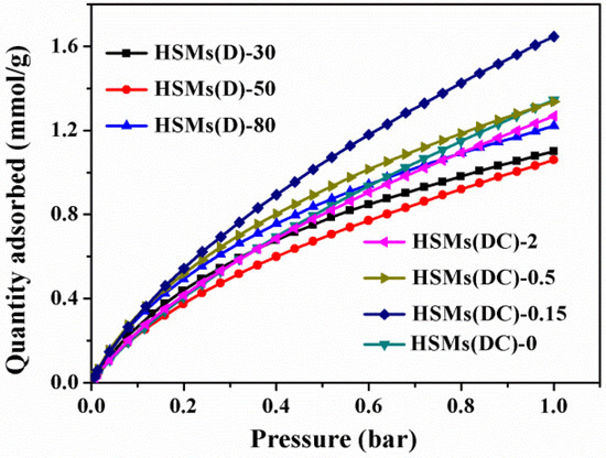 Figure 6 shows the CO2 adsorption isotherms of HSMs(D) and HSMs(DC), and Table 1 lists the CO2 adsorption capacities measured at 273, 298 K, and 1.0 bar. As can be seen in Figure 6, the amount of CO2 adsorption for the unmodified series of HSMs(D) and HSMs(DC) ranged from 1.00 to 1.64 mmol/g. All the isotherms exhibited low adsorption contents at low pressure and high adsorption contents at high pressure, suggesting that the isotherm adsorption profiles were attributable to the predominance of physical adsorption processes. Moreover, it was observed that these samples of CO2 adsorption performance correlated with the pore structure. As shown in Figure 6, the order of adsorption capacity for HSMs(D) series at 273 K and 1.0 bar was HSMs(D)-80 > HSMs(D)-30 > HSMs(D)-50; the adsorption performance was not directly related to the specific surface area and pore volume. As shown in Table 1, although HSMs(D)-30 had the lowest BET-specific surface area and pore volume, its CO2 adsorption capacity of 1.1 mmol/g was slightly more than that of HSMs(D)-50 (1.0 mmol/g) because of the increased microporous content of HSMs(D)-30 (Smi = 210 m2/g) compared with that of HSMs(D)-50 (Smi = 70 m2/g). Moreover, HSMs(D)-80 had the highest CO2 adsorption capacity of 1.22 mmol/g due to the relatively high specific surface area and appropriate micropore content. As shown in Figure 6, the CO2 adsorption capacity was in the following order: HSMs(DC)-0.15 > HSMs(DC)-0 > HSMs(DC)-0.5 > HSMs(DC)-2, and the highest CO2 adsorption amount reached 1.64 mmol/g for HSMs(DC)-0.15 at 273 K and 1.0 bar. Comparability, for the HSMs(DC) series, an increase in CO2 adsorption capability was observed. This result was mainly attributed to the higher micropore surface area and larger pore volume compared with those of HSMs(D). According to the previous discussion, high CTAB content in the composite template was beneficial for improving the micropore surface area and mesopore size of the hierarchical porous silica. Therefore, the effect of the pore structure of HSMs(DC) played an important role in the improvement of CO2 adsorption capability. The samples with higher micropore surface areas and pore volumes exhibited an enhanced ability to capture CO2 molecules. Furthermore, the existence of mesopores in the hierarchical porous silica material facilitated the flow of CO2 into the material because of the smaller diameter of the CO2 molecule (CO2: 3.3 Å) compared with that of the mesopore [47]. In addition, as the adsorption temperature rose to 298 K, as shown in Figure S4 (Supporting Information), the CO2 adsorption capability of the samples significantly declined, confirming that the interaction between the CO2 molecule and sorbent surface was attributable to physical absorption.