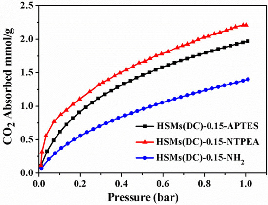 Figure 7 displays the CO2 adsorption isotherms of HSMs(DC)-0.15-APTES, HSMs(DC)-0.15-NTPEA, and HSMs(DC)-0.15-NH2 modified with amine groups. The amounts of adsorbed CO2 were 1.98 mmol/g for HSMs(DC)-0.15-APTES, 2.22 mmol/g for HSMs(DC)-0.15-NTPEA, and 1.38 mmol/g for HSMs(DC)-0.15-NH2 at 273 K and 1 bar. It was found that the CO2 adsorption capacity of HSMs(DC)-0.15 improved after modification with APTES and NTPEA through the post-grafting method. The surface area and pore volume of HSMs(DC)-0.15-APTES were higher than those of HSMs(DC)-0.15-NTPEA, while the amount of CO2 adsorption HSMs-0.15-NTPEA was higher than that of HSMs(DC)-0.15-APTES. On the basis of the corresponding surface area and weight loss data, the obtained -NHx densities were 1.41 × 10−3 mmol/m2 for HSMs(DC)-0.15-APTES and 3.7 × 10−3 mmol/m2 for HSMs-0.15-NTPEA. Compared with HSMs(DC)-0.15-APTES, HSMs(DC)-0.15-NTPEA, with its higher -NHx density, had a higher amount of CO2 adsorption [48]. These results suggest that the key parameters of the CO2 adsorption capability of amine-modified materials are not only surface area and pore volume but also the density of -NHx on the surface of the matrix. Meanwhile, as shown in Figure 7, the capacity of CO2 adsorption for HSMs(DC)-0.15-NH2 declined to 1.38 mmol/g, which was lower than that of unmodified HSMs(DC)-0.15. As evidenced by N2 adsorption–desorption measurement, the main reason was that the pore was filled by APTES molecules; therefore, a certain number of pores was blocked and inaccessible to CO2 molecules, resulting in a low CO2 sorption capacity.