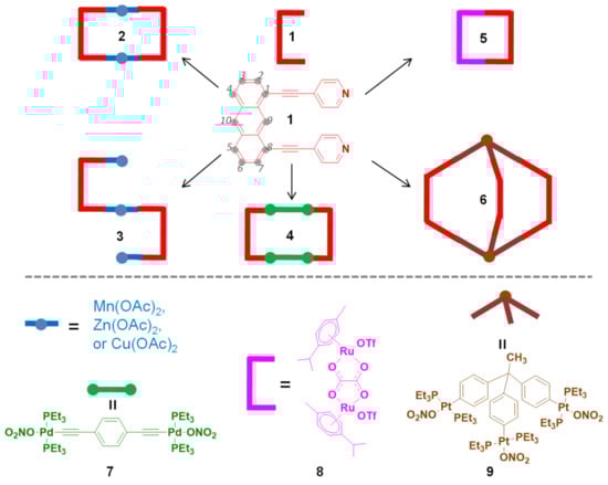 The combination of the anthracene moiety with organic coordination groups affords the rigid and versatile functional building blocks. After reacting with the complementary metallic reagents, a number of anthracene-based coordination assemblies have been documented including metallacycles and metallacages. In general, the nitrogen-based coordination linkers have been mostly employed in constructing discrete supramolecular structures compared to the metal–carbon or metal–oxygen coordination-driven self-assembly. For instance, ligand 1,8-bis(4-pyridylethynyl)anthracene (1) has been used as a rigid nitrogen-based organic “clip” to construct both rectangles and trigonal prisms (Figure 1). Considering the flexible coordination sphere of the 3d-metal ions, the equimolar reactions of 1 with 3d-metal acetate linear linkers such as Mn(II), Zn(II), or Cu(II) acetates result in the formation of either rectangular (2) or zigzag polymeric (3) structures [35]. However, after changing the metal linkers to 1,4-bis[trans-Pd(PEt3)2(NO3)(ethynyl)]benzene (7), it only affords the rectangle product 4 due to the rigid square planar coordination environment of Pd(II) [36,37]. The similar phenomenon was also observed for the other square planar coordination metal linkers such as Pt(II) complexes [38,39]. The half-sandwiched RuII2 metal precursor [Ru2(μ-η4-C2O4)(MeOH)2(η6-p-cymene)2](O3SCF3)2 (8) has also been demonstrated to react with 1 in 1:1 molar ratio to form the 2D metallacycle 5 [40]. Moreover, the 3D nanoscopic prismatic cage 6 with tunable shape, size, and properties was fabricated by mixing the tritopic Pt(II) linker 1,1,1-tris[4-(trans-Pt(PEt3)2(NO3))phenyl]ethane (9) with 1 in 2:3 molar ratio [41,42]. Recently, Jin, Hahn, and co-workers presented a series of iridium(III) metalla[2]catenanes prepared from a non-linear but rigid dipyridyl donor ligand 1,5-bis(4-pyridylethynyl)anthracene [43]. Due to the nonlinear structure and aromatic π–π and C–H···π interactions of the ligand, the controlled transformations between tetranuclear metallarectangles and metalla[2]catenanes were realized in solution by changing the solvent, concentration, or guest species. In addition, the incorporation of halogen atoms into the dinuclear metal complex bridge led to interlocked metalla[2]catenanes with two different topological configurations in the solid state.
