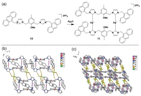 Besides the nitrogen-based organic donor ligands, the strong σ-donating NHC can form stable metal–carbon bonds to generate supramolecular structures. The NHC coordination complexes exhibit unusual chemical-physical properties and show promising applications in catalysis [44,45,46], sensing [47], and medicine chemistry [48]. Zhang and co-workers integrated NHCs with supramolecular host calixarene fragments to synthesize the dinuclear Ag(I) metallamacrocycles functionalized with multi-anthracene groups [49]. As shown in Figure 2a, the anthracene-capped NHC ligand precursor 10 reacted with Ag2O to afford metallacycle 11. X-ray diffraction analysis indicated that 2D supramolecular layer (Figure 2b) and 3D supramolecular network (Figure 2c) were observed by viewing along the different axis of 11. The 3D network was assembled by the π–π interactions of the intermolecular anthracene rings with a face-to-face separation of 3.367 Å and the C–H∙∙∙F interactions among PF6− anions and various proton atoms. The configurations of the metallacycle structures can also be modulated by changing the upper-rims of calixarenes or the N-substituents of the carbene ligand [49].