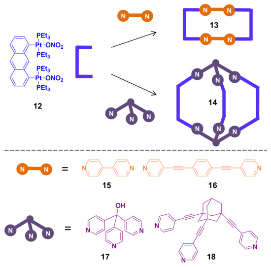 Diplatinum(II)-based anthracene-containing linker 12 for constructing nitrogen-based 2D and 3D coordination self-assemblies.