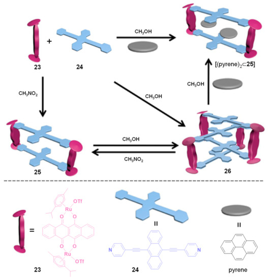 As shown in Figure 5, Chi and co-workers disclosed the reversible structural transformations between monorectangle and metalla[2]catenane via guest- and solvent-dependent self-assembly [70]. The assembly of the tetracene-based diruthenium(II) acceptor 23 and the anthracene-functionalized dipyridyl donor 24 afforded multiple stimulus-responsive supramolecular structures. Specifically, the [M2L2] monorectangle structure 25 was obtained in an equivalent molar mixing of the donor and acceptor linkers in nitromethane (CH3NO2). After changing the solvent to methanol (CH3OH), an interlocked [M2L2]2 metalla[2]catenane 26 with strong π–π interactions was formed. Interestingly, the addition of pyrene into the identical reaction in methanol generated the pyrene-encapsulated host−guest complex [(pyrene)2⊂25]. X-ray crystal structure studies indicated that two pyrene guests were bound in the aromatic cavity of 25 via host−guest interactions.