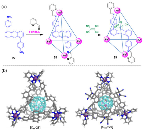 Compared to metallacycle-based hosts, metallacages or capsules can introduce more tight and selective binding affinity for large guest substrates. For example, the Nitschke group employed a C2-symmetric 1,5-diaminoanthracene 27 building block to generate the anthracene-edged FeII4L6 tetrahedral cage 28 (Figure 6a) [24]. The Diels−Alder cycloadditions of the six anthracene panels of 28 with the electron-deficient dienophile reagent such as tetracyanoethylene (TCNE) yielded the new cage 29. The modified cage 29 possessed an enclosed cavity suitable for the encapsulation of the fullerene C60 to give the host–guest complex [C60⊂29]. In contrast, the treatment of the original cage 28 with C60 formed a covalent adduct [C60∙28] through the Diels−Alder cycloadditions of three of its anthracene ligands with C60. The remaining three anthracene ligands of [C60∙28] can further react with TCNE to give a new product (structure not shown) by post-assembly modification. These topologically controlled modifications would be unable to access if the reaction components were added together before assembly. As shown in Figure 6b, X-ray diffraction analysis of [C60∙28] and [C60⊂29] confirmed the tetrahedral cage structure and the covalent Diels−Alder cycloaddition reactions of TCNE and C60 with the iron cage.