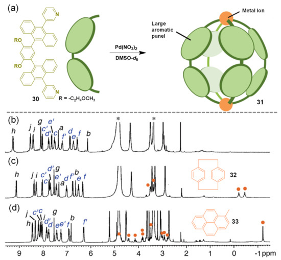 Yoshizawa and co-workers designed a new bent bispyridine-anthracene linker 30 with an orthogonal conformation of the aromatic sub-units [30]. The combination of Pd(II) ions and 30 in a 1:2 molar ratio afforded the formation of a M2L4 capsule 31 possessing a cavity with a diameter around 1 nm (Figure 7a). The encapsulations of the medium-sized spherical guest [2,2]paracyclophane 32 and the planar guest 1-methylpyrene 33 were monitored by 1H NMR techniques (Figure 7b–d). The X-ray crystal structure of the host-guest scaffold [(33)2⊂31] further demonstrated that the cavity of 31 was able to encapsulate two guest molecules of 33. Moreover, the larger molecule fullerene (C60) also formed host-guest complexes with 31 in quantitative yields. The same group expanded the above platform to Pt(II)-linked coordination capsules using the same bispyridine-anthracene skeleton with different metal ions and substitutes [71]. The highly emissive host–guest complexes with fluorescence quantum yields up to 0.5 were successfully obtained by the encapsulation of various molecular dyes such as 4,4’-difluoro-4-bora-3a,4a-diaza-s-indacene (BODIPY) and coumarin derivatives.