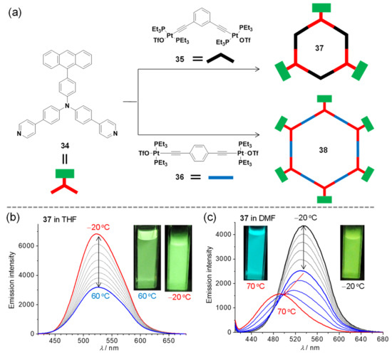 Stimulus response can be defined as the phenomenon that the substrates are capable of altering their structural and/or physical–chemical properties in response to external stimulus such as temperature, light irradiation, pressure, chemicals, solvent, and so on. The development of stimulus-responsive materials has attracted extensive research interests in order to mimic bioprocesses and explore functional materials [72,73,74,75]. Anthracene-based supramolecular architectures with intriguing photophysical, photochemical, and host-guest behavior represent a promising category of stimulus-responsive material candidates. For instance, three or six freely rotating anthracene groups have been incorporated into organoplatinum(II) hexagonal metallacycles to show temperature-responsive behavior (Figure 8). The treatment of the 120° anthracene-functionalized triarylamine ligand 34 with the 120° diplatinum(II) acceptor 35 or the 180° diplatinum(II) acceptor 36 generated the [3 + 3] or [6 + 6] hexagonal metallacycles 37 and 38, respectively [76]. The resulting assemblies exhibited reversible fluorescent response in tetrahydrofuran (THF) upon temperature variation from −20 to 60 °C (Figure 8b). However, in coordinating solvent such as dimethyl formaldehyde (DMF), they showed two-stage responses (Figure 8c). In the lower temperature range (below 30 °C), the emission spectral changes were similar to those observed in THF. At higher temperatures, the metallacycles were destroyed by the solvents and exhibited ratiometric fluorescent response. The further development of a dianthracene-based rhomboidal organoplatinum(II) metallacycle showed both temperature and mechanical-force dependent fluorescence [77]. Very recently, Wang, Xu and co-workers studied the luminescence properties of the platinum(II) metallacycles with inner- and outer-modified 9,10-distyrylanthracene units, indicating that the modified position of fluorophores played a vital role in modulating the properties of supramolecular assemblies [78].