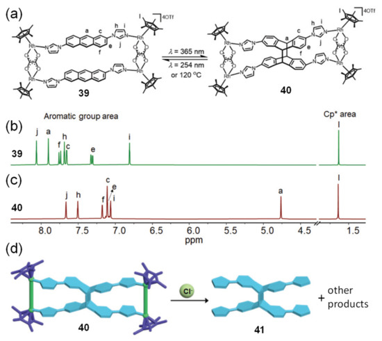 Photo-driving chemical transformations have been widely investigated in modern organic synthesis and materials science [79,80]. Anthracene-based derivatives usually show interesting photochemical reactions of anthracene at 9,10 positions, including [4 + 4] photodimerization and [4 + 2] oxygenation [81]. The integration of anthracene units into supramolecular architectures provides a versatile platform to achieve chemo- and region-selective photochemical transformations. The Han group reported the rhodium-based photoactive metallarectangle 39 containing the 2,6-di(1H-imidazol-1-yl) anthracene linker (Figure 9). The photochemical [4 + 4] cycloaddition of 39 regioselectively occurred to afford the syn-dimeric photo-addition product 40 in quantitative yield under irradiation at 365 nm, which could be clearly discerned from the 1H NMR spectral changes [82]. The reversible transformation was further observed by thermal- or photo-induced (254 nm) cleavage reaction. Moreover, the pure organic photodimer 41 could be readily released from the metallarectangle in high yield (Figure 9d), which was difficult to access via conventional organic ligand-based reactions. Another rhodium-rectangle with a 2,7-bis(4-pyridyl)anthracene linker showed similar photo- and thermal response. The same group also employed the supramolecular templating strategy to other kinds of metallasupramolecular assemblies. For example, N-heterocyclic carbene- or azole-2,6-disubstituted anthracenes have been used to react with Ag(I) or Au(I) metallic reagents to generate metallacycles, which showed appealing regio- and stereo-selectivity on the photochemical [4 + 4] cyclodimerization [83].