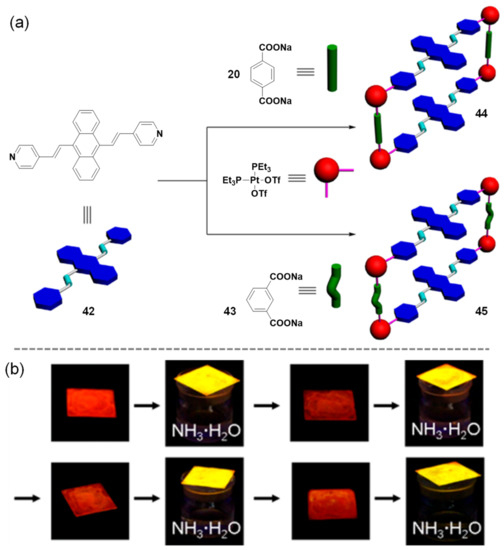 Molecular sensing can be generally considered as a sensor that interacts with an analyte to generate a detectable signal variation. The sensor molecule usually consists of two (or more) subcomponents that perform the recognition and signaling function, respectively. Selective and precise detection of target analytes is indispensable in a wide range of chemical, material, biological, environmental, and medical sciences [86,87,88]. Among these efforts, anthracene-containing metalla-supramolecular systems can incorporate multiple functional components into well-defined structures, providing the appropriate structural and chemical features for molecular sensing. Stang and co-workers developed a series of platinum(II)-based metallacycles for the selective and sensitive fluorescent detection of chemicals such as ammonia, nitroaromatics, amino acids, and so on [89,90]. As shown in Figure 10a, they employed the 9,10-di(4-pyridylvinyl)anthracene ligand (42) to react with dicarboxylates (20 or 43) and cis-(PEt3)2Pt(OTf)2 linkers for fabricating two near-infrared (NIR) emissive platinum(II) metallacycles 44 and 45 [91]. The resulting assemblies not only showed aggregation-induced emission (AIE) and solvatochromism behavior, but also exhibited NIR fluorescent detection of ammonia gas in the solid state (Figure 10b). The reversible forming and breaking of the Pt-N coordination bonds was proposed for the observed emissive sensing properties. In addition, Mukherjee and co-workers synthesized a ditopic 180° Pt-ethynyl-based acceptor, which could react with the 1,8-bis(4-pyridylethynyl)anthracene (1) organic donor to yield an emissive metallamacrocycle [38]. The emission intensity of the metallamacrocycle was selectively and efficiently quenched in solution by the addition of picric acid, which is a common component in many chemical explosives. The charge-transfer processes between the electron-rich Pt-ethynyl-anthracene backbones and the electron-deficient nitroaromatic molecules were believed to be responsible for the resulting fluorescence quenching behavior.