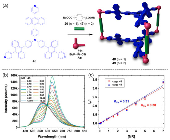 Very recently, Li and co-workers fabricated two trigonal prismatic metallacages 48 and 49 via a three-component self-assembly of two molecules of the trianthracene−triphenylamine-based tripyridyl ligand 46, three molecules of dicarboxylate 20 or 47, and six molecules of the 90° Pt(II) linker cis-(PEt3)2Pt(OTf)2 (Figure 11a) [96]. Being beneficial from the well-organized multi-anthracene−triphenylamine moieties, the obtained cages displayed unique absorption and emission properties with high emission quantum yield and stimulus-responsive fluorescence (solvent polarity, temperature, and concentration). Moreover, the efficient FRET between the cage energy donor and the Nile Red (NR) energy acceptor was realized with an energy transfer efficiency of >93% at an acceptor/donor ratio of 15/1 (Figure 11b,c). The apparent static quenching mechanism was proposed for the efficient energy transfer process.