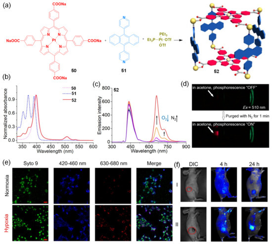 Huang et al., reported a dual-emissive Pt(II) metallacage for in vivo hypoxia imaging and imaging-guided chemotherapy (Figure 12) [97]. In the molecular design, Pt(II)-meso-tetra(4-carboxyphenyl)porphine (50) was employed as an oxygen concentration responsive red phosphorescence unit, while the anthracene-based ligand 51 was selected as a blue fluorophore and cis-(PEt3)2Pt(OTf)2 was selected as the 90° Pt(II) linker for the coordination-driven assembly. The absorption and emission studies of the obtained cage 52 presented the blue/red ratiometric emission changes corresponding to the variation of the oxygen (O2) or nitrogen (N2) atmosphere (Figure 12b–d). The encapsulation of cage 52 into an amphiphilic polymer methylpoly(ethyleneglycol)-block-poly(g-benzyl-l-glutamate) provided the metallacage-loaded nanoparticles with a loading efficiency of 65%, which could be further applied to detect the hypoxia environment both in vitro and in vivo (Figure 12e,f). In vivo studies indicated that the nanoformulations not only showed radiometric imaging of the tumor hypoxia condition, but also were capable of effectively suppressing the tumor growth.
