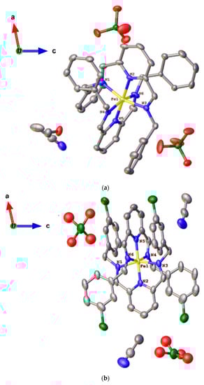 The single crystal X-ray diffraction data for the complexes 1 and 2 were collected at 120 K. Compound 1 crystallizes in a monoclinic crystal lattice with space group C2/c, whereas 2 crystalizes in a triclinic lattice with space group P. An asymmetric unit of 1 consists of one discrete [FeL2]2+ cation, two ClO4− ions and one methanol solvent molecule (Figure 2a). However, the asymmetric units of 2 contain one discrete [FeL2]2+ cation, two ClO4− ions and two acetonitrile solvent molecules (Figure 2b). The unit cell of 1 contains eight complex units, sixteen counter anions and eight solvent molecules, whereas 2 contains two complex units, four counter anions and four solvent molecules (Figure S2c,d).
