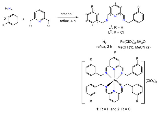 On account of the above facts and considering ligand-field and electronic effects, we are herein reporting our investigations on the structural and spin-state of two mononuclear FeII Schiff base complexes having N6–coordination. The ligands were designed without a substituent in L1 (2,6-bis[(benzylimino)methyl]pyridine) and with an electron-withdrawing chloro substituent at the meta position in L2 (2,6-bis[(3_chlorobenzylimino)methyl]pyridine) in comparison with the electron-donating methyl group of the previous reports [34,35].