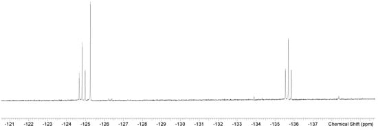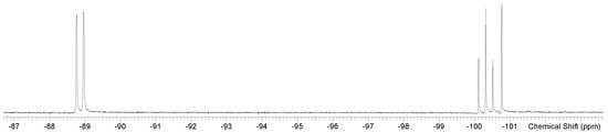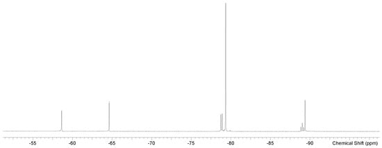 In contrast, the corresponding spectra of [GeF2(Me4-cyclam)][OTf]2 exhibit six 19F{1H} resonances (Figure 6), four doublets and two singlets. These may be attributed to the presence of four of the five possible stereoisomers (with the Me groups ‘all up’, ‘up,up,up,down’, ‘up,up,down,down’—2 variants and ‘up,down,up,down’ relative to the GeN4 plane) of a trans octahedral geometry with slow pyramidal inversion at N; the larger (14-membered) ring of Me4-cyclam allowing the germanium to sit within the ring. The coordinated fluorides are inequivalent in the ‘all up’ and ‘up,up,up,down’ forms, accounting for the four doublets, whilst the two singlets probably correspond to the equivalent fluorines in the other two stereoisomers. We cannot rule out the possibility that one of the singlets corresponds to a cis isomer, but this seems less likely.