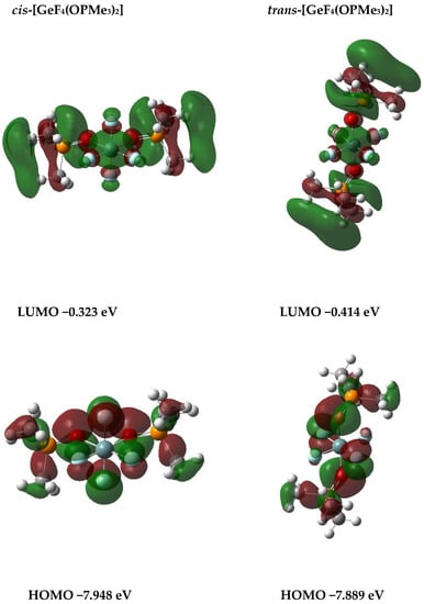 Representations of the HOMO and LUMO of cis- and trans-[GeF4(OPMe3)2].