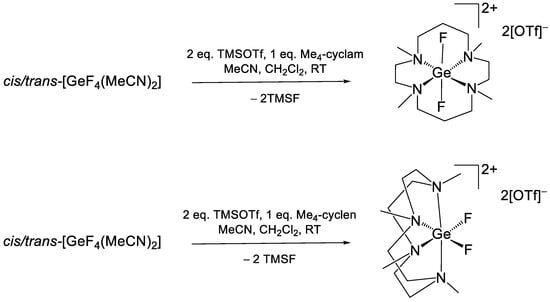 CCDC reference numbers for the crystallographic information files in cif format are 2174295 ([GeF3(OPPh3)3][OTf]) and 2177877 ([GeF2(Me4-cyclen)][OTf]2 xCH3NO2). These data can be obtained free of charge via http://www.ccdc.cam.ac.uk/conts/retrieving.html (accessed on 20 June 2022), or from the Cambridge Crystallographic Data Centre, 12 Union Road, Cambridge CB2 1EZ UK.