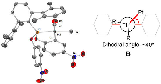 ORTEP view of the X-ray molecular structure of complex 1∙CO, with ellipsoids at the 50% probability level and H atoms omitted for clarity (left); schematic view of the B conformation adopted by the ligand PArXyl2(OPhNO2)2 (right) [18,26]. Selected bond distances (Å) and angles (°): Pt1-P1 2.2643(8), Pt1-C1 2.054(2), Pt1-C2 2.110(3), Pt1-C3 1.901(2), C3-O1 1.126(3); P1-Pt1-C1 80.86(6); C1-Pt1-C2 90.78(9); C2-Pt1-C3 88.06(1); C3-Pt1-P1 100.41(8).