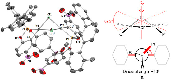 ORTEP view of the X-ray molecular structure of complex 2, with ellipsoids at the 50% probability level and H atoms omitted for clarity (left); schematic view of the coordination planes in 2 with the angle they form and the binary axis C2 (top right); schematic view of the B conformation adopted by the ligand PArXyl2(OPhNO2)2 (bottom right) [18,26]. Selected bond distances (Å) and angles (°): Pt1-P1 2.146(1), Pt1-C1 1.974(4), Pt1-Cl1 2.410(1), Pt1-Cl1′ 2.398(1); P1-Pt1-C1 82.6(1); C1-Pt1-Cl1′ 95.4(1); Cl-Pt1-Cl′ 82.89(4); Cl1-Pt1-P1 99.10(4); Pt1-Cl1-Pt1′ 82.60(4).