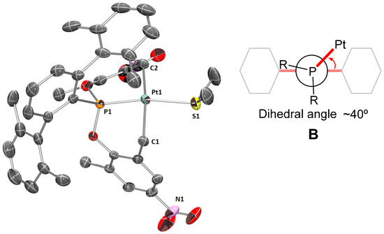ORTEP view of the X-ray molecular structure of complex 3·SMe2, with ellipsoids at the 50% probability level and H atoms omitted for clarity (left); schematic view of the B conformation adopted by the ligand PArXyl2(OPhNO2,Me)2 (right) [17,25]. Selected bond distances (Å) and angles (°): Pt1-P1 2.1526(9), Pt1-C1 2.155(3), Pt1-C2 2.120(3), Pt1-S1 2.339(1); P1-Pt1-C1 84.18(7); C1-Pt1-S1 86.74(8); S1-Pt1-C2 99.09(9); C2-Pt1-P1 89.23(8); C1-Pt1-C2 169(1).