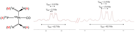 - In the 1H NMR spectrum, the four diasterotopic methylene protons are coupled with the 31P nucleus, thus constituting first-order AMX spin systems, which give rise to a doublet (2JHH = 11.5 Hz, 3JHP ≈ 0 Hz) and a triplet (2JHH ≈ 3JHP = 11.5 Hz), both with 195Pt satellites;