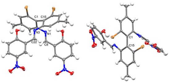 The single crystals of ZH4 suitable for X-ray structure determination were grown from an EtOH solution. The structure is displayed in Figure 1, in which the C1–C15 length of the biphenyl moiety is 1.498(4) Å. The imine moieties had a C=N bond (C22-N3: 1.275(5) Å; C8-N1: 1.265(5) Å) slightly shorter than those of the unsubstituted analogue (1.283(1) Å) [47] and the analogous 3-methoxy substituted ligand (1.285(2) and 1.280(2) Å) [47]. This might be due to the presence of the electron-withdrawing nitro group. The C-N(nitro) bond lengths of 1.451(5) and 1.423(5) Å were within a normal C-N single bond. The C-O distances (1.325(5) and 1.320(5) Å) were similar to those of the unsubstituted analogue (1.354(2) Å) and the analogous 3-methoxy substituted ligand (1.353(7) Å). However, the C-Br bond distances (1.896(3) and 1.893(3) Å) were within the same range observed for both the unsubstituted and MeO-substituted analogues [46,47].