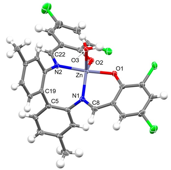 Molecular structure of Z1Zn determined by X-ray diffraction at 100 K. The ellipsoids are drawn with a 50% probability. White: H, gray: C, blue: N, red: O, light green: Cl, and blue-gray: Zn.