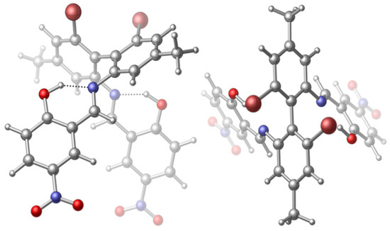 Elemental analyses (C, H and N) were measured at the Institute of Organic and Macromolecular Chemistry of the Friedrich Schiller University in Jena, Germany. Infrared spectra were recorded with a Bruker FT-IR-4100 spectrometer (Bremen, Germany). 1H- and 13C-NMR spectra were recorded on a Bruker AC 400 MHz spectrometer. Chemical shifts were reported in ppm relative to TMS as internal standards. Melting points were recorded on a melting point apparatus, SMP3. Electronic absorption spectra were measured on a PS-2600 Pasco spectrophotometer (Saarbrucken, Germany) in DMSO solvent using 8 × 10–5 M solutions. All reagents were obtained from Merck, Acros or Sigma Aldrich (Taufkirchen, Germany) and used without further purification. The starting amines, 2,2′-diamino-4,4′-dimethyl-6,6′-dibromobiphenyl [29] and halide-free analogue [47], were prepared according to literature procedures. The theoretical modelling of Schiff base ligands was performed using Wave function Spartan’18 Parallel Suite on a desktop computer with core i725.