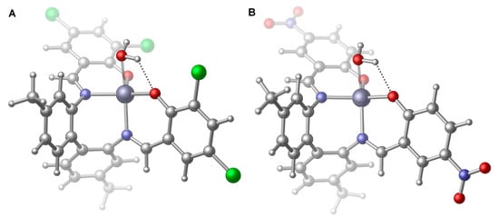 The aryl moieties of the biphenyl backbone were twisted with angles between the planes by 87.31° (exp. 83.89°). The large torsion angle was attributed to the steric requirements enforced by bromine substituents. This was consistent with the experimentally reported aryl–aryl dihedral angle of 80° for a similar dibromo-substituted biphenyl ligand [59]. Smaller torsion angles (between 21° and 68°) for the halide-free analogues, where there was flexible twisting between the two biphenyl planes, were observed [46]. The optimized geometries of Z1Zn and Z2Zn are elucidated in Figure 5. The results indicated that the monoligated complexes exhibited a penta-coordinated zinc ion with distorted trigonal bipyramidal geometry. The computed H2O···M bond was 2.247 Å (exp. 2.082(3) Å) and 2.238 Å (exp. 2.1966(18) Å) for the Z1Zn and Z2Zn complexes, respectively. Additionally, the calculated Zn-O bond lengths around the Zn ion were [Z1Zn: 1.970, 1.947 Å (exp. 2.027(3) and 1.966(3) Å); Z2Zn: 1.949, 1.983 Å (exp. 1.9496(18) and 1.9740(18) Å)], while the calculated Zn-N bond lengths were [Z1Zn: 2.048, 2.102 Å, (exp. 2.048(3) and 2.107(3) Å); Z2Zn: 2.087, 2.057, Å (exp. 2.140(2) and 2.039(2) Å)].