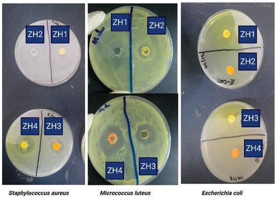 A representative bacterial culture showing the inhibition zone in Gram-positive (Staphylococcus aureus and Micrococcus luteus) bacteria by compounds ZH1, ZH2, ZH3 and ZH4 ((left) and (middle)) compared to lack of antimicrobial activity against Gram-negative bacteria (Escherichia coli) (right).