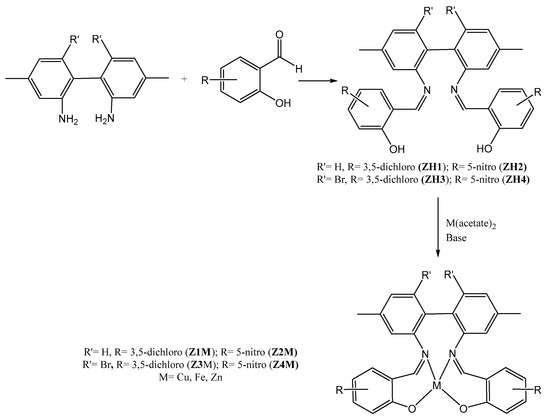 Synthesis of symmetrical Schiff bases ZH1–ZH4 and their Cu, Fe and Zn complexes.