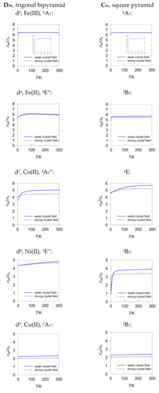 The modelling of the magnetization and susceptibility for pentacoordinate dn systems is presented in Figure 3 and Figure 4. A counterpart of these graphs for the tetragonally distorted octahedral systems can be found elsewhere [16]. In the case of zero-field splitting with an orbitally non-degenerate ground term, the effective magnetic moment in the high-temperature limit of 300 K remains almost linear with zero slope; at low temperature, it is reduced. This is the case of d5-D3h, d5-C4v, d6-C4v, d7-D3h, and d8-C4v. For d9-D3h and d9-C4v, zero-field splitting is absent, so these systems follow the Curie law. The magnetization saturates to the value of M1 = Mmol/(NAμB) = gavS when the zero-field splitting is small. This is the case of d5-D3h, d5-C4v, d6-C4v, d9-D3h, and d9-C4v; exceptions are d7-D3h and d8-C4v, with large zero-field splitting D parameters.