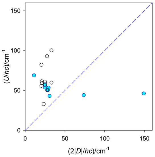 Collection of relaxation data for tetracoordinate Co(II) complexes, S = 3/2. Full points for D < 0, empty for D > 0. Dashed line—a hypothetical D-U paradigm. (1/kB) = 1.439 K/cm−1.