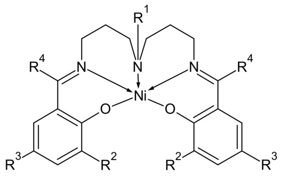 Schematic representations of pentacoordinate Ni(II) complexes. 1: R1 = R3= −CH3, R2 = −C(CH3)3, R4 = H; 2: R1 = −CH3, R2 = R4 = H, R3= Br; 3: R1 = −CH3, R2 = R4 = H, R3= I; 4: R1 = −CH3, R2 = R3 = −C(CH3)3, R4 = H; 5: R1 = −CH3, R2 = R3 = R4 = H; 6: R1 = R3 = R3 = H, R4 = −CH3.