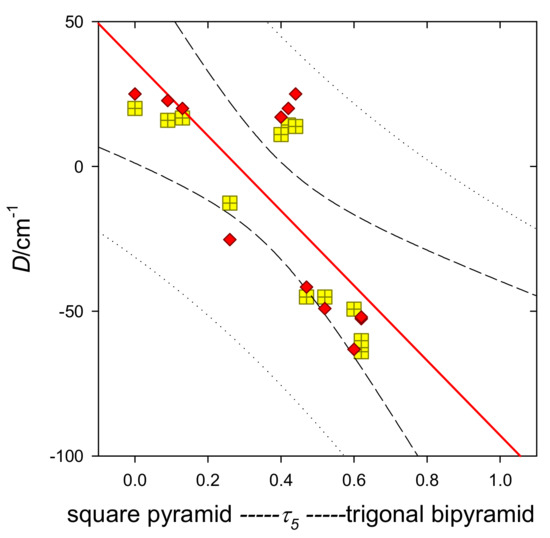 Dependence of the D parameter in pentacoordinate Ni(II) complexes on the distortion parameter (τ5). Yellow squares—magnetometric data; red pica—ab initio calculations; solid—correlation line, dashed—confidence intervals, dotted—prediction intervals.